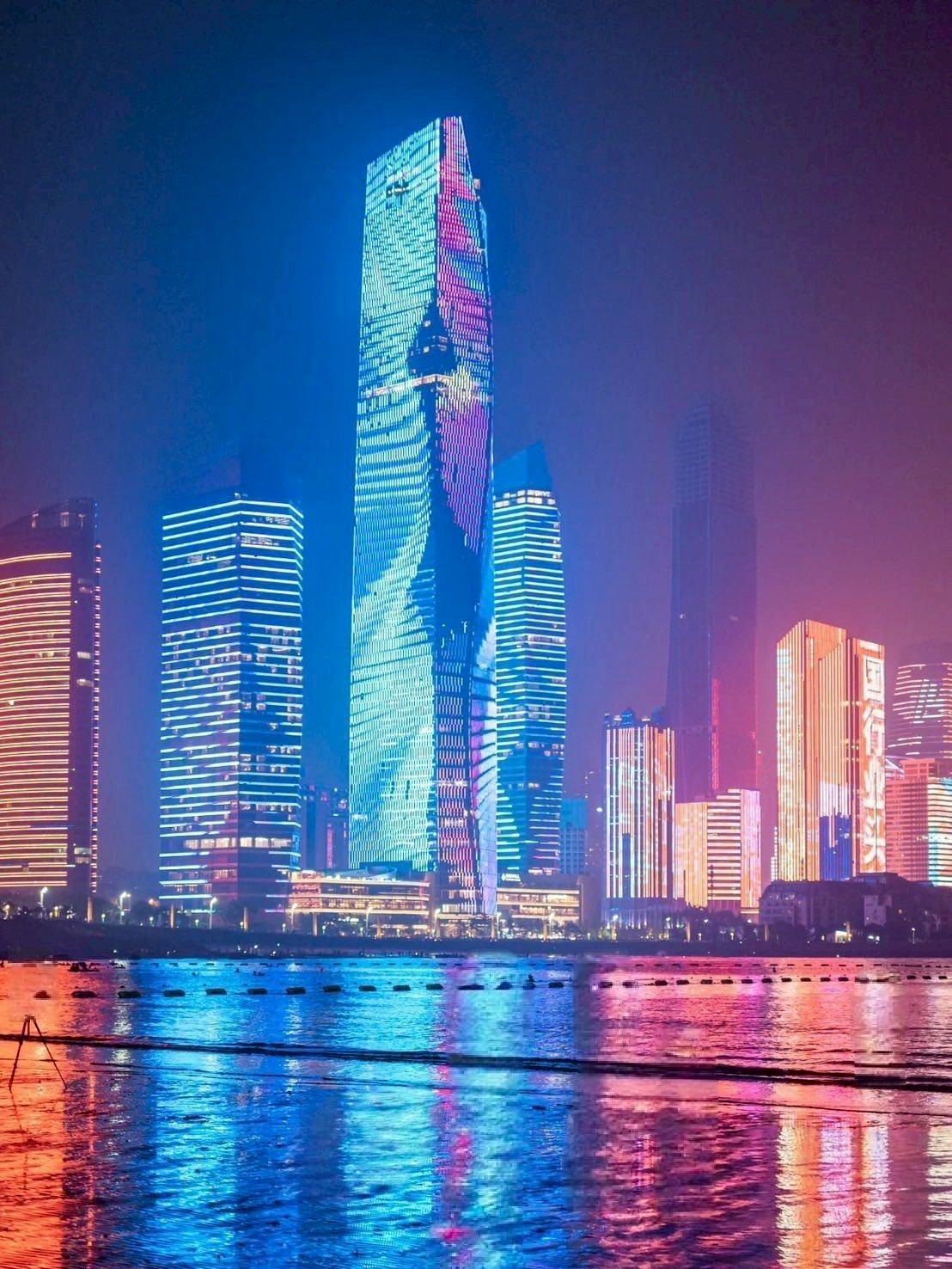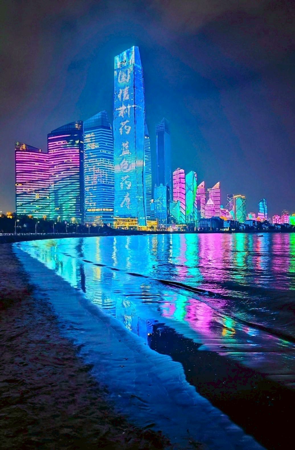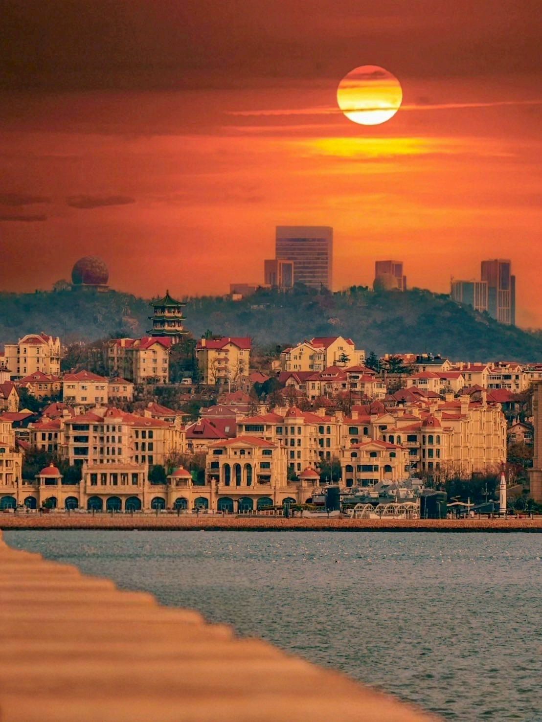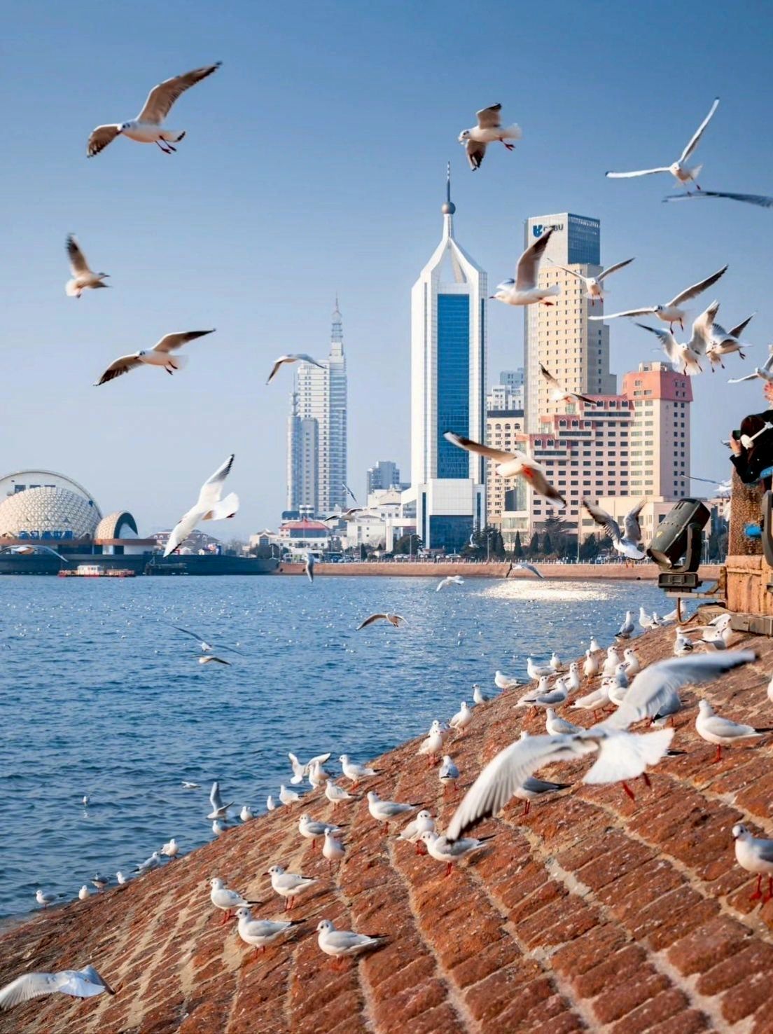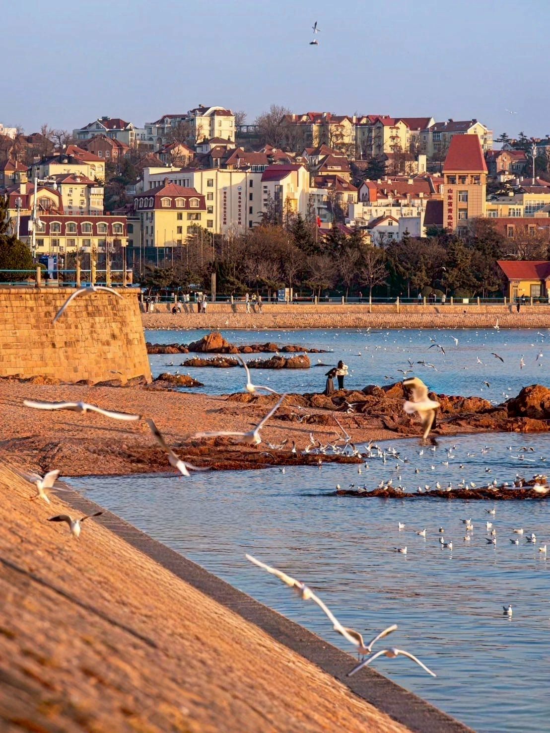 แลนด์มาร์กริมหาด Fushan Bay ตึกสูงสมัยใหม่เรียงราย นักท่องเที่ยวนิยมมาให้อาหารนกนางนวล ชมพระอาทิตย์ตก และถ่ายรูปตึกระฟ้าสะท้อนน้ำทะเล