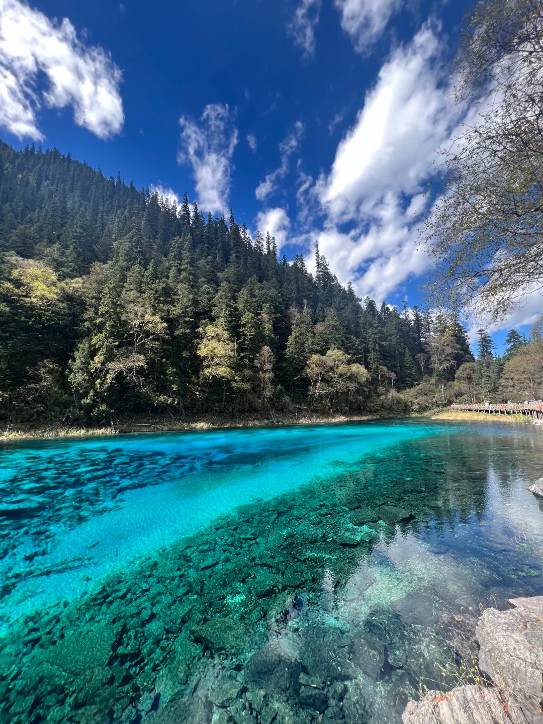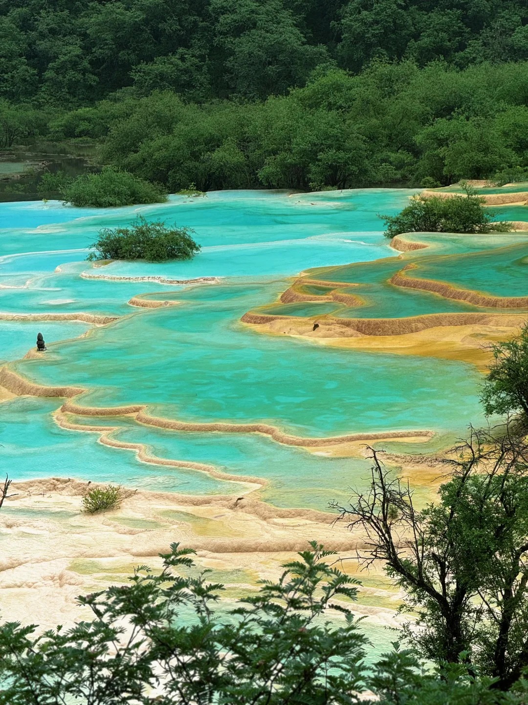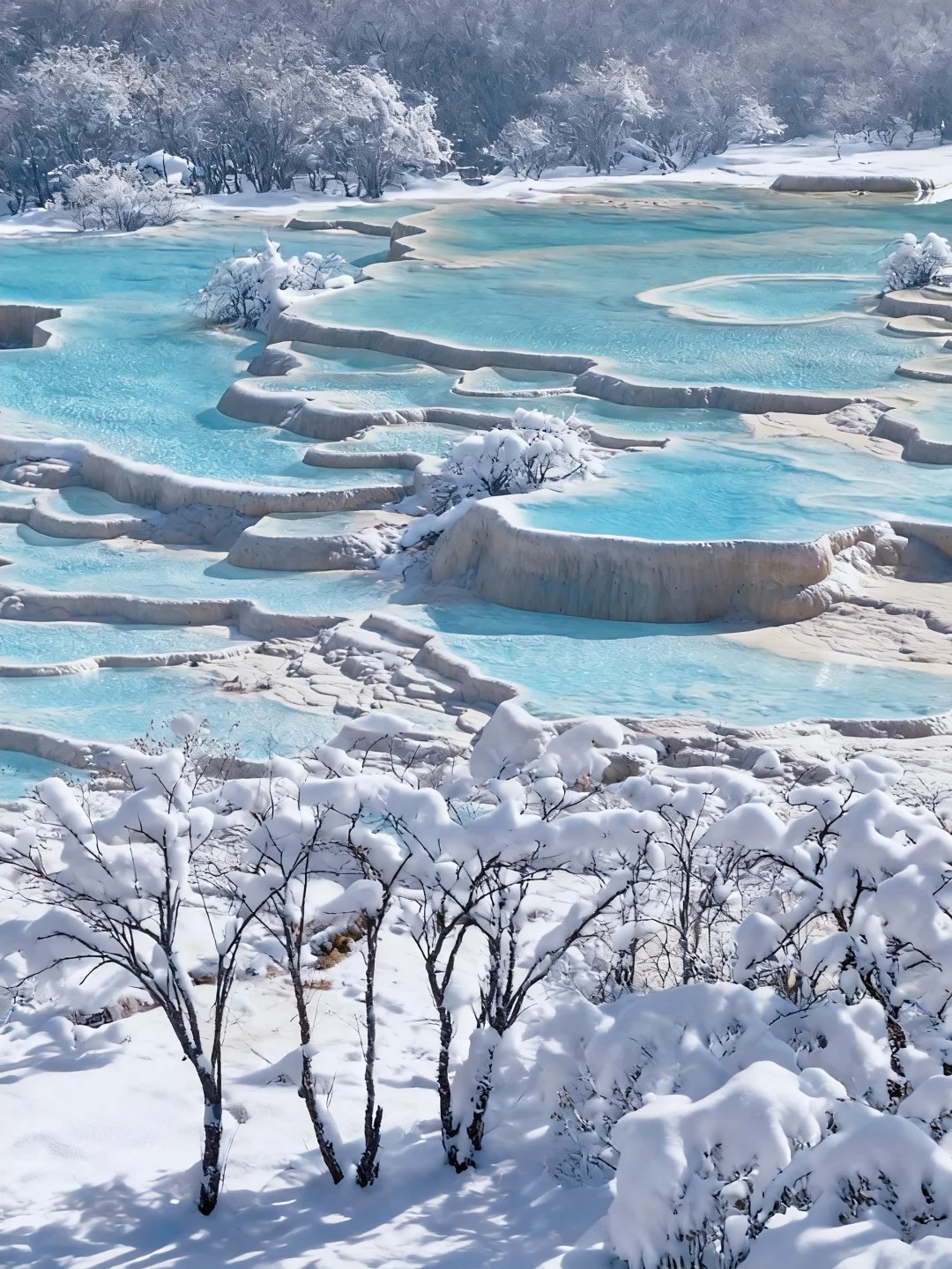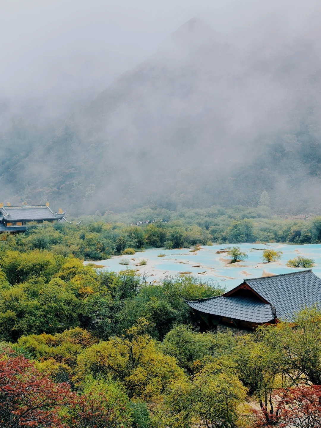 โดดเด่นด้วยบ่อน้ำสีฟ้าขุ่นเรียงเป็นชั้นคล้ายขั้นบันไดธรรมชาติ สวยสะกดสายตา โดยเฉพาะในฤดูใบไม้ร่วงที่ภูเขารอบข้างแต่งแต้มด้วยสีทองแดงและเหลืองอร่าม